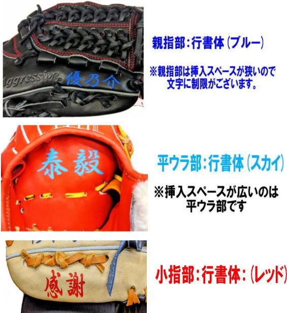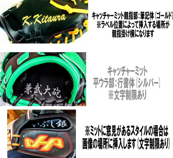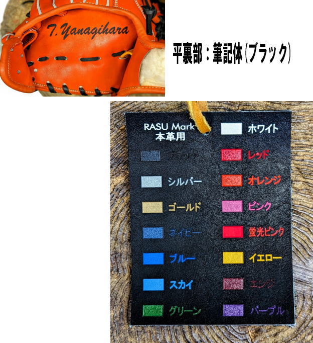 | 挿入箇所と書体、カラーの選択をご指定してください。 筆記体の相場は頭文字も大文字で後は小文字が相場です 例: Sennari スラッガー少年軟式グラブの平裏はブラック(本体カラー)です ラスマークは糸で刺繍するのではない いわゆる「レーザー刻印」とご理解ください ラスマーク加工の技術は潟Lタミツ様の特許です 特徴として文字にカラーを塗装するのが特許となっております。 そして、「ラスマーク」というネーミングも意匠登録されています。 無断で「ラスマーク」というネーミングを使用するのは禁止されています。 当店は潟Lタミツ様から「ラスマーク」とうネーミングを使用する許可をいただいております ※合皮製のグラブは挿入不可です |